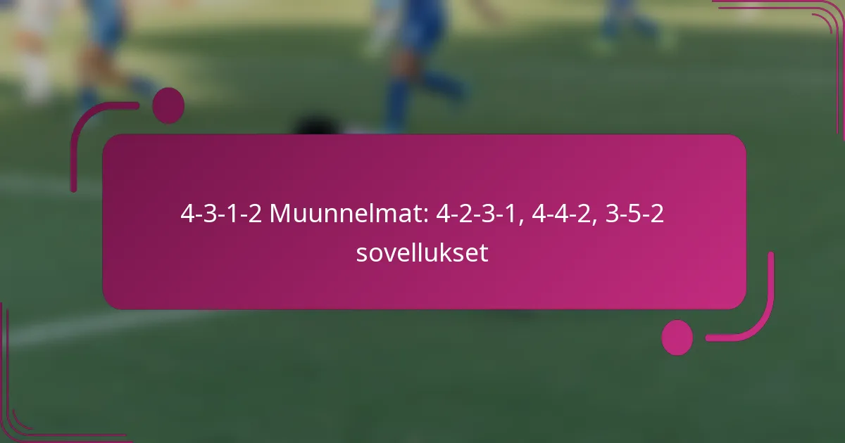 4-3-1-2 -muotoilu toimii monipuolisena taktisen asetelman muodossa jalkapallossa, tasapainottaen puolustuksen vahvuuden ja hyökkäysvaihtoehdot. Muunnelmat, kuten 4-2-3-1 ja 4-4-2, mukauttavat tätä muotoilua parantaakseen keskikentän hallintaa ja tarjotakseen enemmän hyökkäysjoustavuutta, kun taas 3-5-2 tarjoaa erilaisen lähestymistavan hyödyntämällä laitapuolustajia leveyden saavuttamiseksi. Jokainen mukautus mahdollistaa joukkueiden räätälöidä strategioitaan pelaajien vahvuuksien ja ottelutilanteiden mukaan.